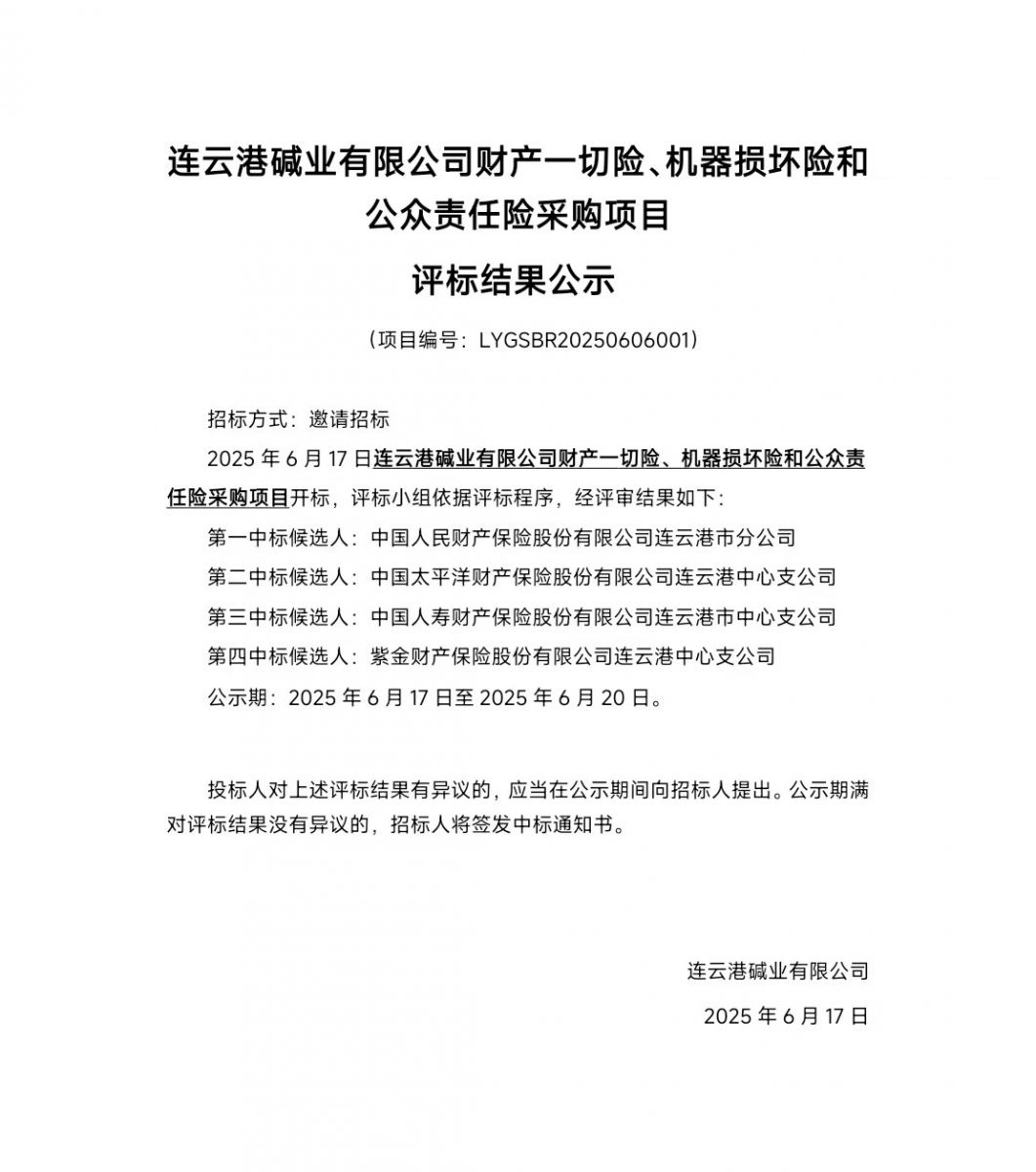 連云港堿業(yè)有限公司財(cái)產(chǎn)一切險(xiǎn)、機(jī)器損壞險(xiǎn)和公眾責(zé)任險(xiǎn)采購項(xiàng)目評(píng)標(biāo)結(jié)果公示
