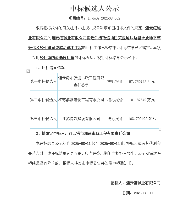 搬遷升級改造項目萊亞地塊垃圾堆放場平整硬化及經(jīng)七路周邊整治施工工程中標(biāo)候選人公示