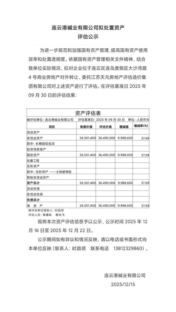 連云港堿業(yè)有限公司擬處置資產(chǎn)位于連云區(qū)連島度假區(qū)大沙灣路4號(hào)商業(yè)房地產(chǎn)資產(chǎn)評(píng)估公示