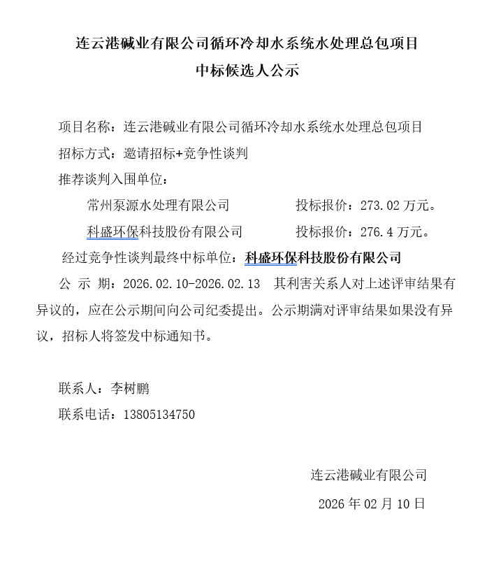 連云港堿業有限公司循環冷卻水系統水處理總包項目中標候選人公示
