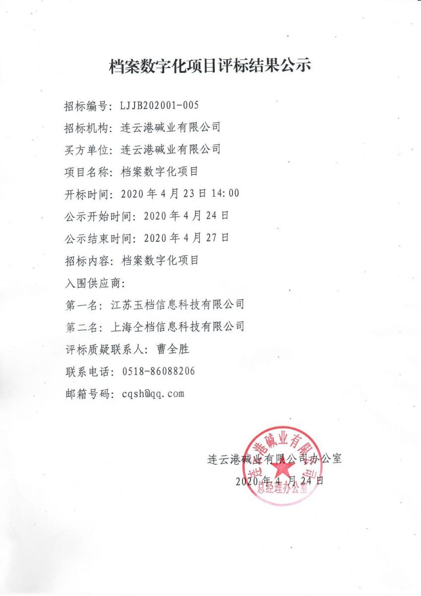 連云港堿業有限公司檔案數字化項目評標結果公示