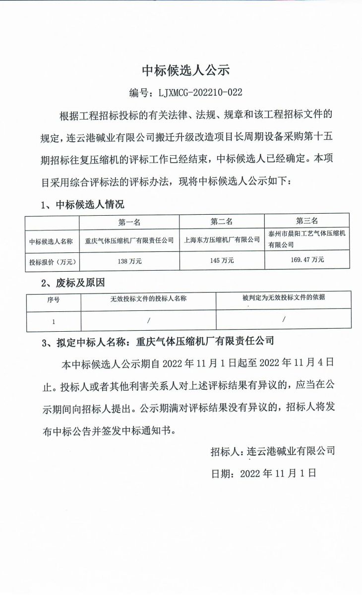 往復壓縮機采購招標中標候選人公示