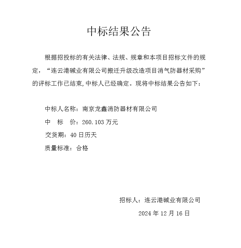 連云港堿業有限公司搬遷升級改造項目消氣防器材中標結果公告